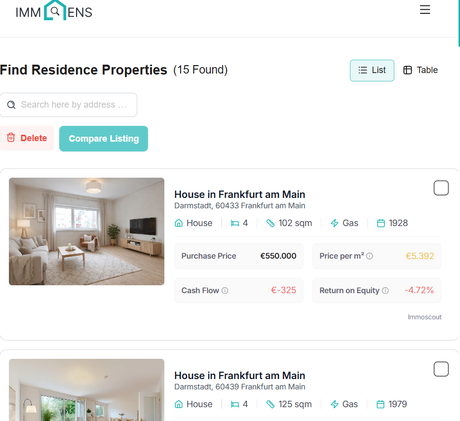 Professionelle Marktdaten direkt in deiner Immobiliensuche. Vergleiche Objekte portalübergreifend und triff fundierte Entscheidungen.